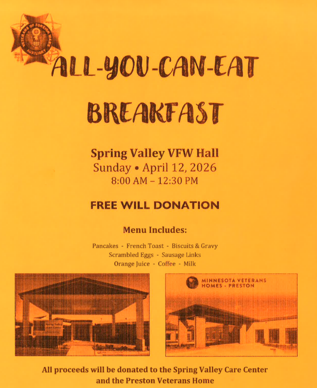 All-You-Can-Eat Breakfast – Spring Valley VFW + Add to Google Calendar + iCal / Outlook export 00 days 00 hours 00 minutes 00 seconds Date Apr 12 2026 Time 8:00 am - 12:30 pm Location VFW Post 4114 and Auxiliary , 104 South Broadway Spring Valley, MN 55975 Website https://www.facebook.com/Spring-Valley-VFW-Post-4114-and-Auxiliary-1619369055000692/ Category Community Share this event