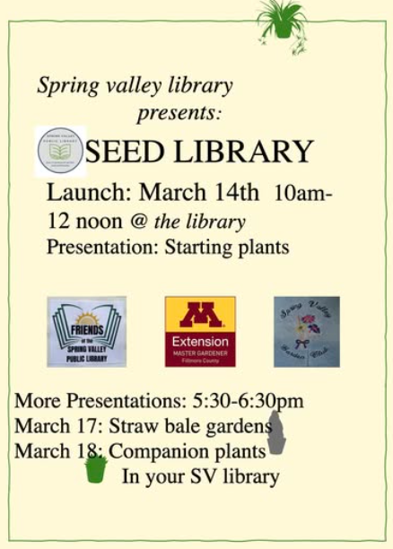 SV Public Library Presents: Seed Library + Add to Google Calendar + iCal / Outlook export 00 days 00 hours 00 minutes 00 seconds Date Mar 14 2026 Time 10:00 am - 12:00 pm Location Spring Valley Public Library, 121 W. Jefferson St. Spring Valley, MN 55975 Category Community Share this event