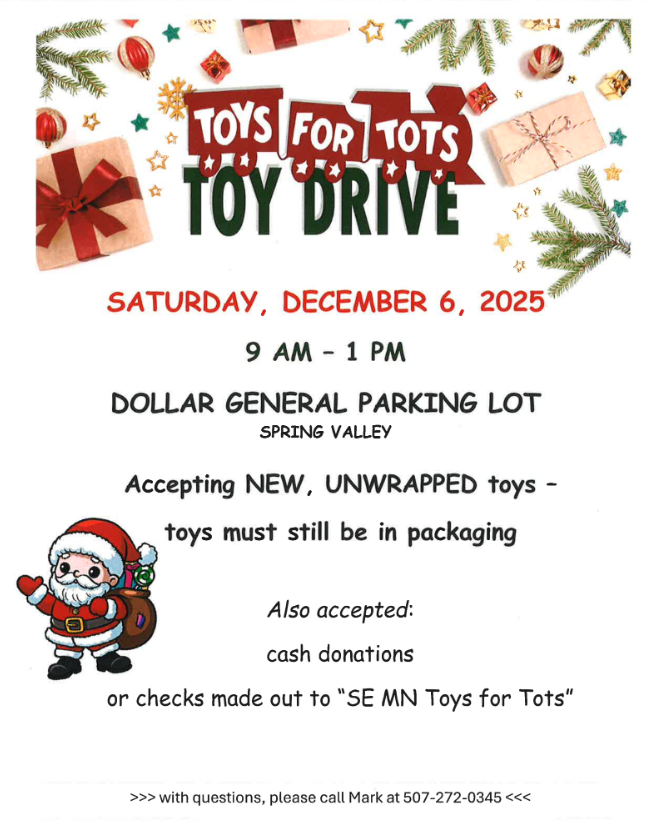 Toys for Tots – Toy Drive + Add to Google Calendar + iCal / Outlook export 00 days 00 hours 00 minutes 00 seconds Date Dec 06 2025 Time 9:00 am - 1:00 pm Location Dollar General 1020 North Broadway, Spring Valley, MN 55975 Category Community Share this event