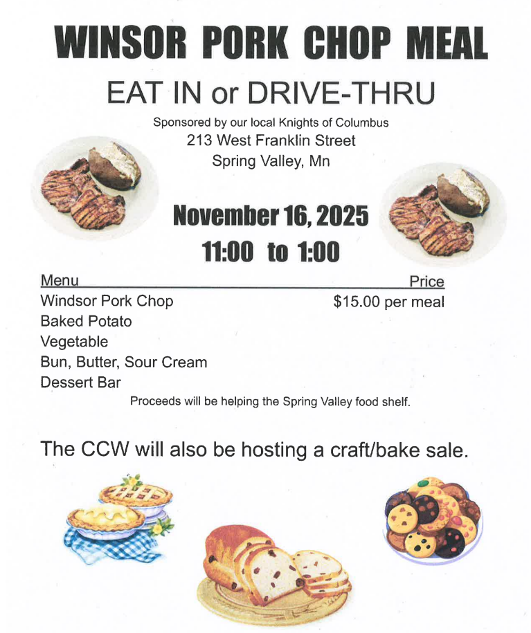 Windsor Pork Chop Meal + Add to Google Calendar + iCal / Outlook export 00 days 00 hours 00 minutes 00 seconds Date Nov 16 2025 Time 11:00 am - 1:00 pm Location St. Ignatius Church, 213 West Franklin St. Spring Valley, MN 55975 Category Community Share this event